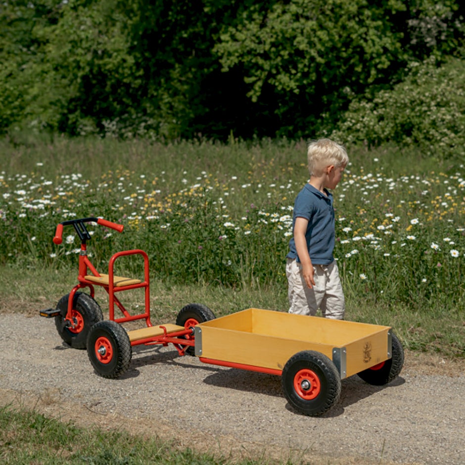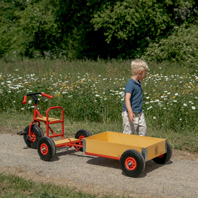 En trehjuling utformad för de lite äldre barnen som håller på att lära sig cykla. Den högkvalitativa trehjulingen från Rose levereras komplett med liten plattform, pedaler, tålig metallram, träsadel, massiva däck och dragkrok. Med en vagn påkopplad förvandlas trehjulingen till en liten lastbil - något som gör leken ännu roligare för barnen.