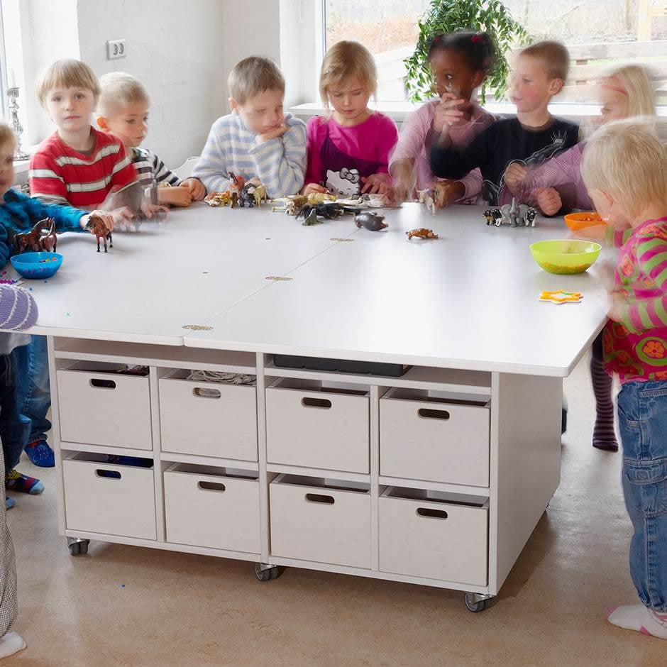 Ett smart aktivitetsbord med fällbar bordsskiva, som gör att bordet kan få två olika storlekar. Multibordet ger möjlighet till mycket förvaring. Under bordet får det plats hela 16 förvaringslådor. Bordsskiva med ljuddämpande linoleum. Försett med hjul. Mått hopfällt B1500 x D750 x H730 mm, mått utfällt B1500 x D1500 x H730 mm.