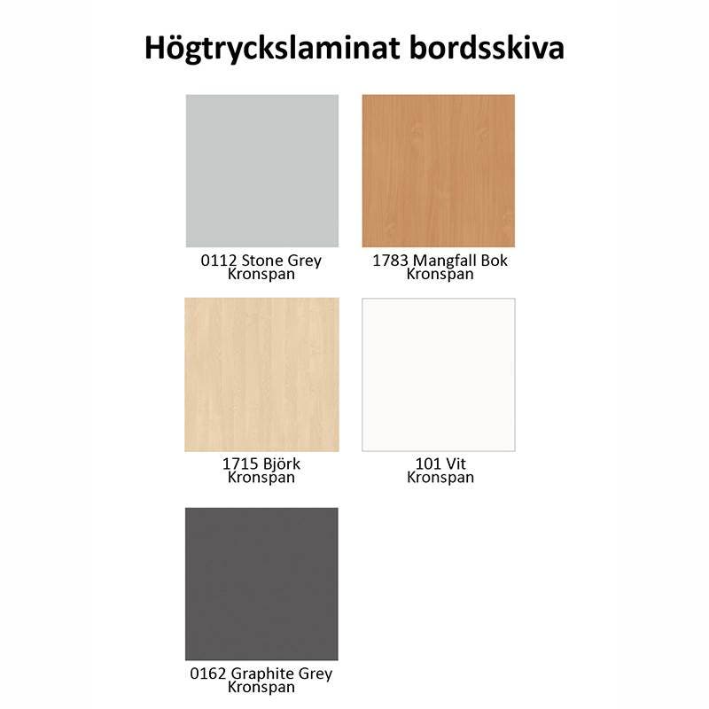 Bordsskivan finns i fem utföranden av laminat, samt i fem färger av dämpande linoleum. Med möjligheten att välja färg på stativet ger det dig möjlighet att välja en tjusig kombination som ger ett betydligt mer levande klassrumsmiljö än vad traditionella skolbord kan erbjuda.