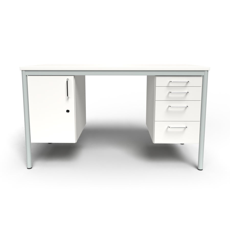 Lärarbordet är försett med en hurts med fyra lådor samt ett skåp, B400 x D565 x H520 mm. Välj på vilken sida av bordet Du vill ha hurts respektive skåp placerat. Hurtsen och skåpet går att få med eller utan lås.