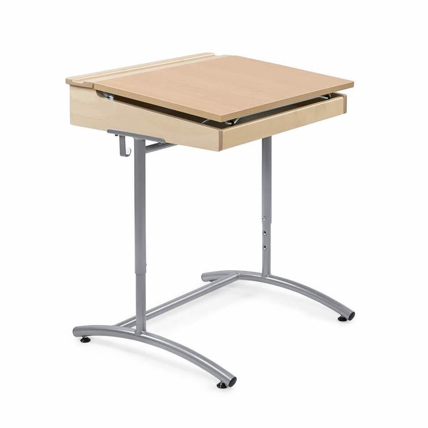 Skolbänk Bridge med bänklåda, tillverkad av bok-, alt. björkkryssfanér med bänklock i laminat. Skivan går att ställa horisontalt eller lutande. Ställbar höjd 720-920 mm. Inåtvända väskkrokar på bägge sidor. Stativ i silvergrått. Helsvetsat underrede.