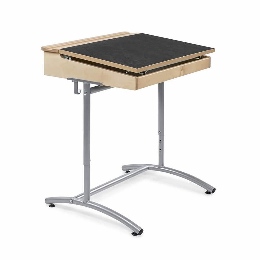 Skolbänk Bridge med bänklåda, tillverkad av bok-, alt. björkkryssfanér och bänklock klätt med ljuddämpande linoleum. Valbar i 6 olika färger. Skivan går att ställa horisontalt eller lutande. Ställbar höjd 720-920 mm. Inåtvända väskkrokar på bägge sidor. Stativ i silvergrått. Levereras omonterad.
