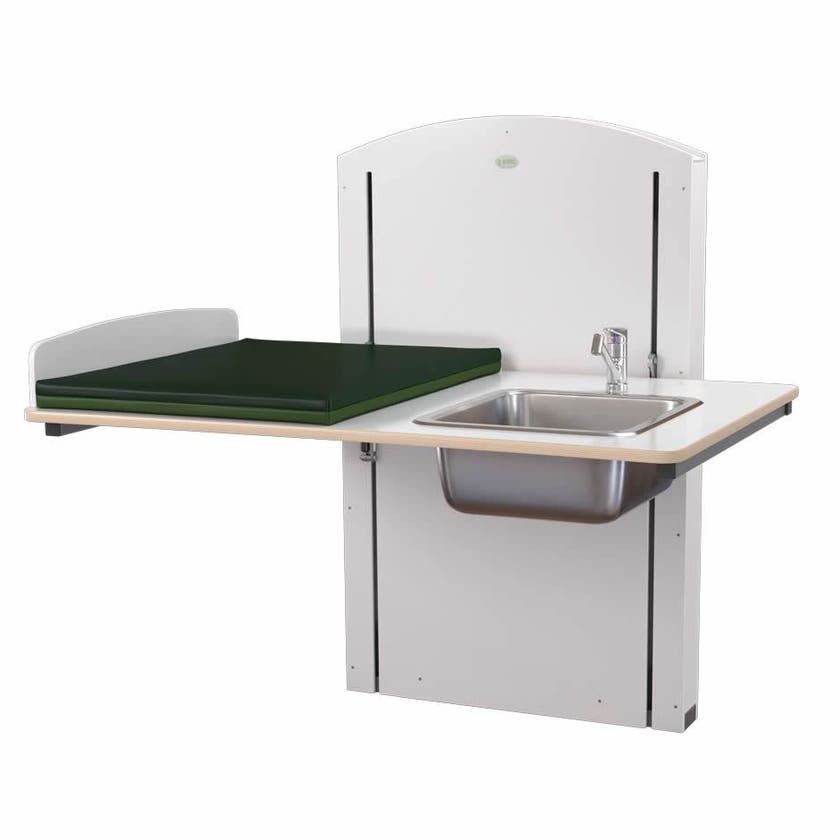 Skötbord med höga skötbordskanter, madrass och tvättdel med vattenblandare med utdragbar dusch och avloppsdetaljer.