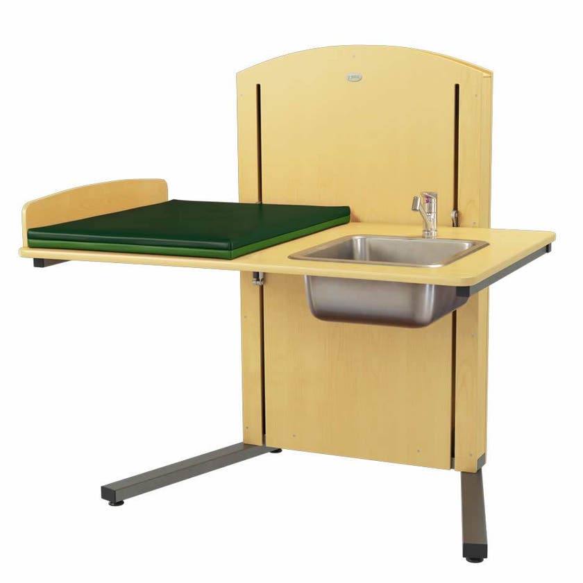 Skötbord med höga skötbordskanter, madrass och tvättdel med vattenblandare med utdragbar dusch och avloppsdetaljer.