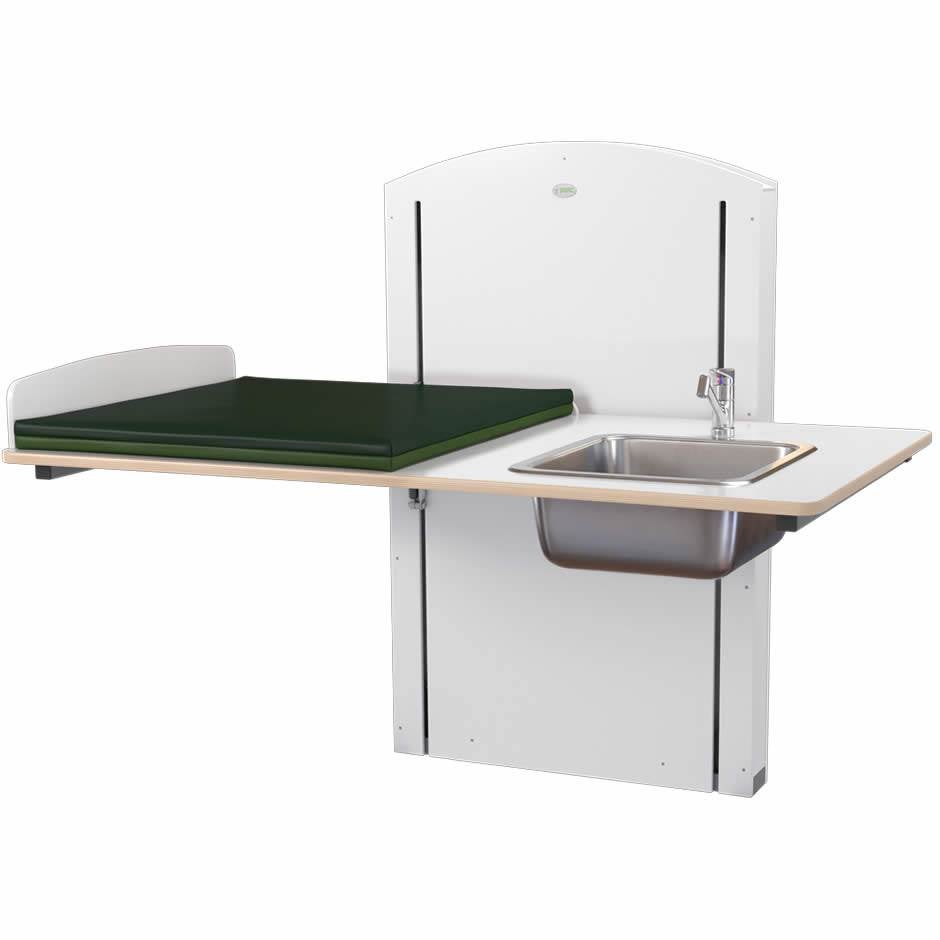 Skötbord med höga skötbordskanter, madrass och tvättdel med vattenblandare med utdragbar dusch och avloppsdetaljer.