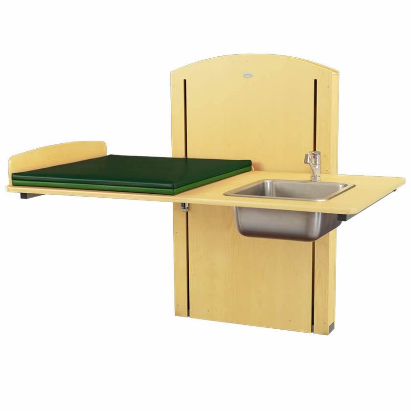 Skötbord med höga skötbordskanter, madrass och tvättdel med vattenblandare med utdragbar dusch och avloppsdetaljer.
