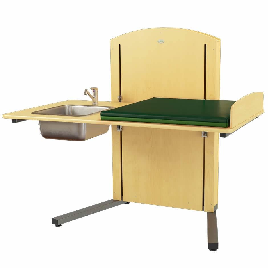 Skötbord med höga skötbordskanter, madrass och tvättdel med vattenblandare med utdragbar dusch och avloppsdetaljer.