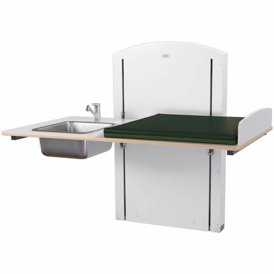 Skötbord med höga skötbordskanter, madrass och tvättdel med vattenblandare med utdragbar dusch och avloppsdetaljer.