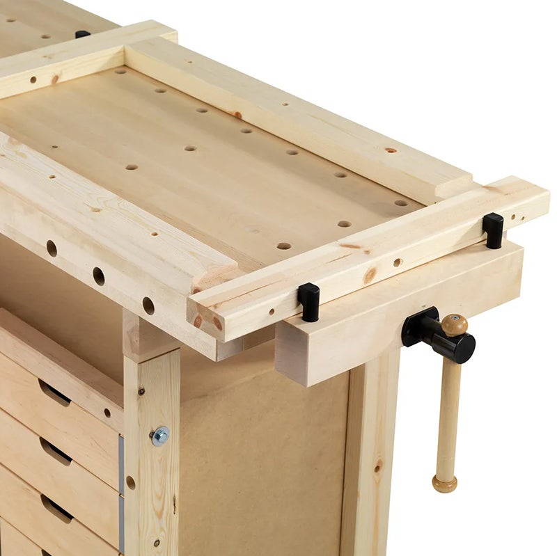 Hyvelbänk Nordic Plus i björk. Skivan är försedd med dubbla hakhålsrader och runda hakhål för flexiblare fastspänning. Bänkhakar ingår.
