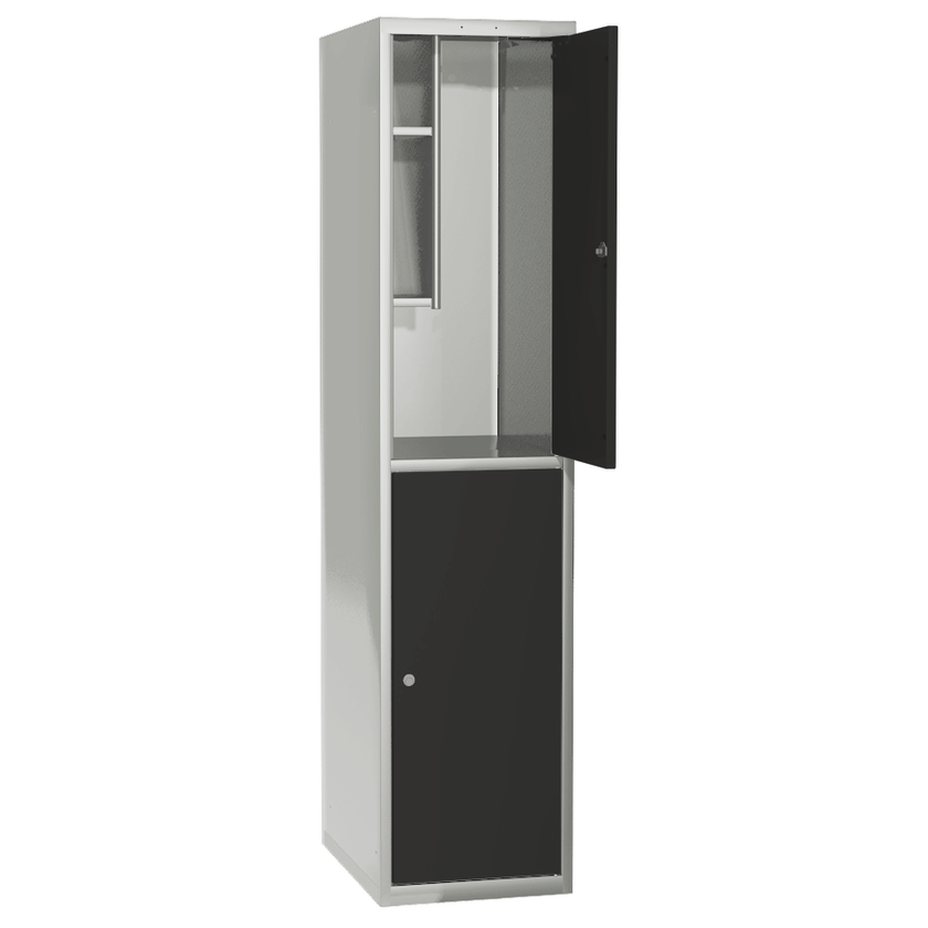 Skåpet har två fack i höjd, utvändigt fackmått B400 x H875 mm. Varje fack är inrett med två bok-/pärmfack och två klädkrokar.