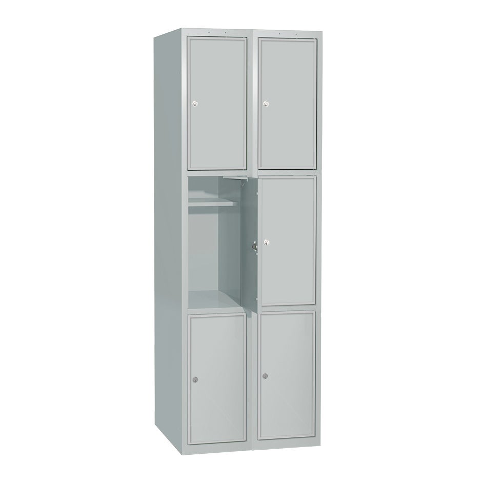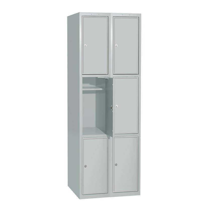 Skåpet har tre fack i höjd, utvändigt fackmått B400 x H583 mm. Varje fack är inrett med en hylla.