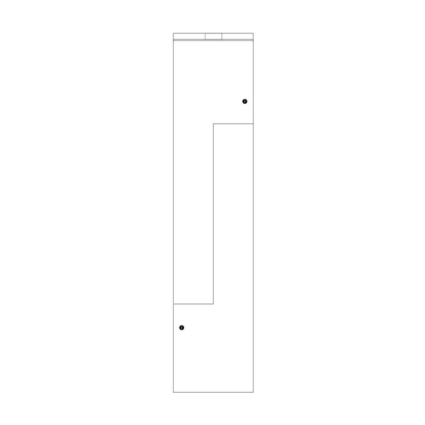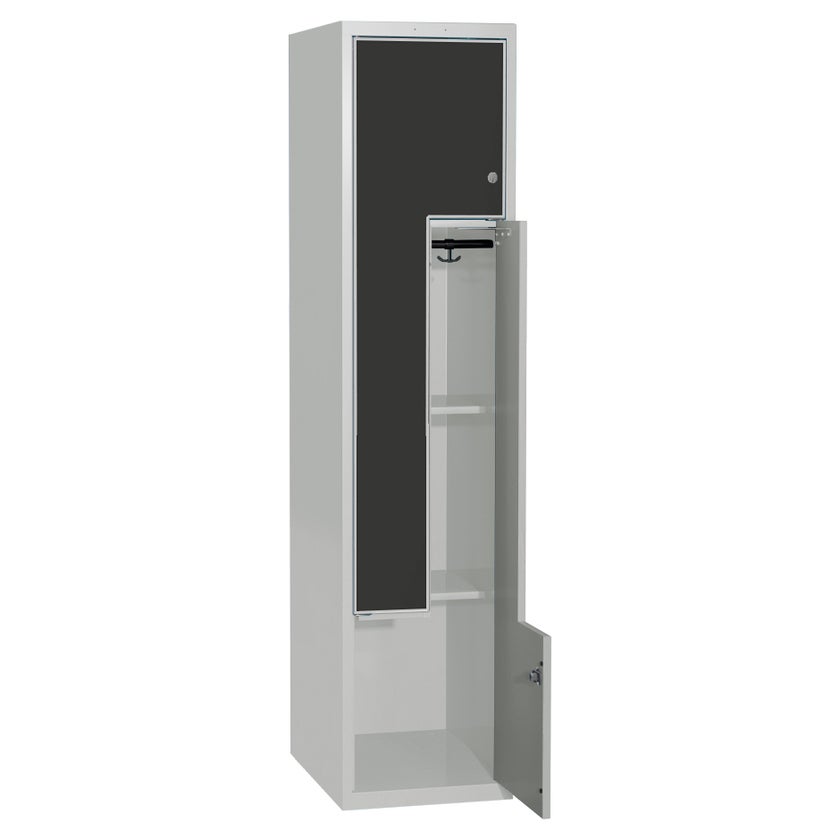 Skåpet har Z-dörr, utvändigt fackmått B400 x H1326/441 mm. Varje fack är inrett med en ankarkrok och två bokfack.
