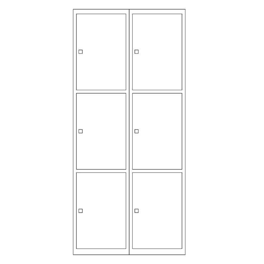 Sektion med 3 x 2 luckor, totalt mått B800 x D400 x H1940 mm. Sockelns höjd 140 mm. Välj mellan klinka för hänglås eller cylinderlås. Huvudnyckel finns som tillbehör.