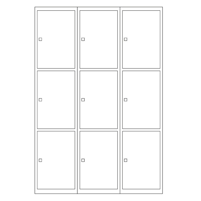 Sektion med 3 x 3 luckor, totalt mått B900 x D400 x H1940 mm. Sockelns höjd 140 mm. Välj mellan klinka för hänglås eller cylinderlås. Huvudnyckel finns som tillbehör.