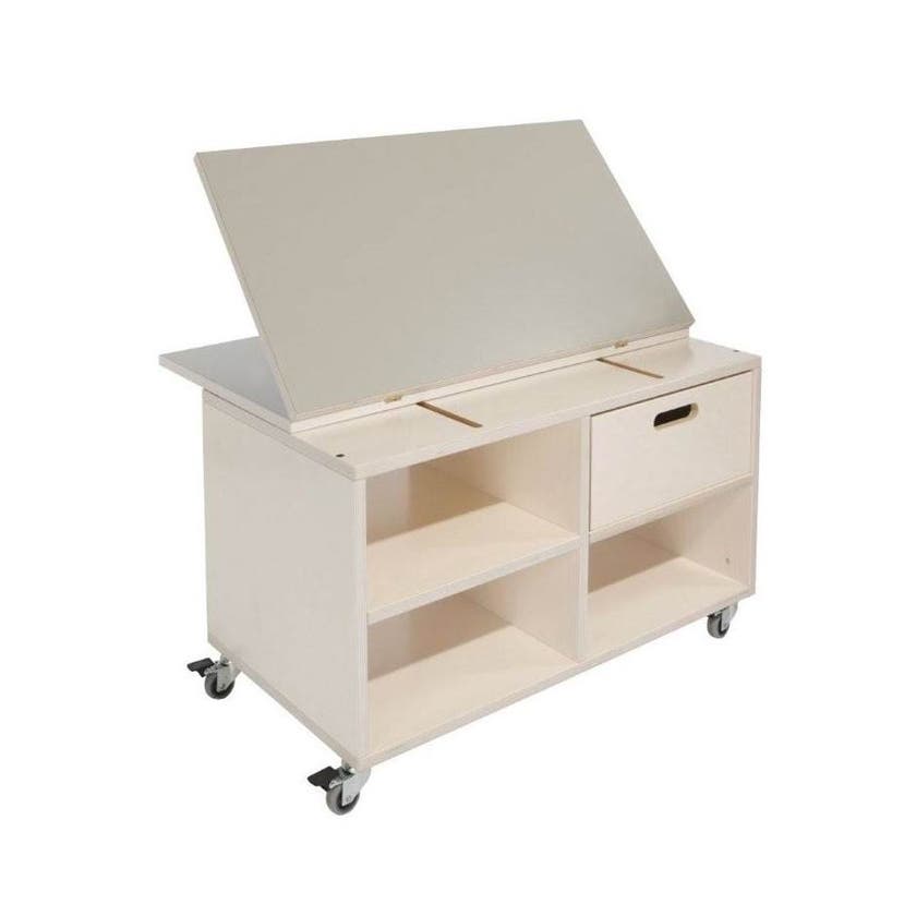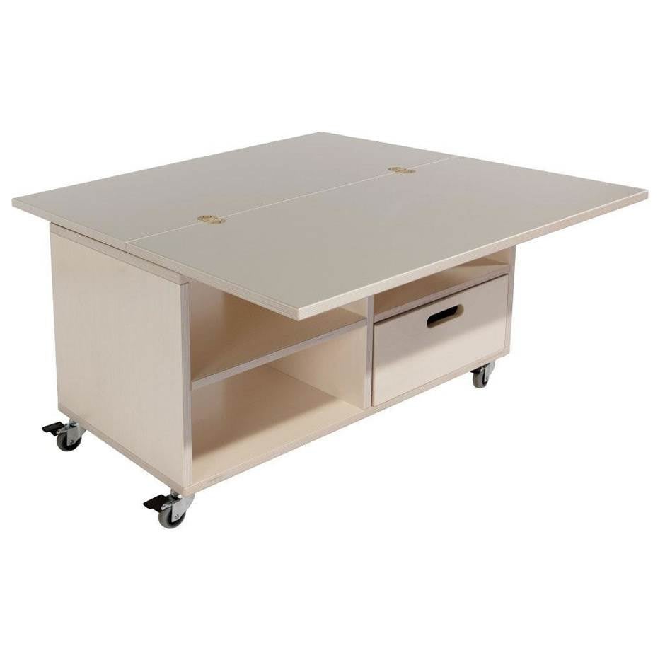 Multifunktionellt bord på hjul med fällbar bänkskiva. Med plats för förvaring på hyllor samt i utdragbara lådor. Tillverkad av 18 mm vitpigmenterad björkfanér. Finns i tre storlekar.