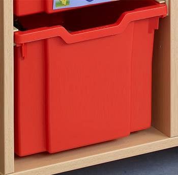 Smidig förvaringsvagn med sex fack och sex höga plastbackar. Plastlådorna glider på plastmedar. Vagnen har fyra svängbara hjul, varav två med broms. Välj mellan vagn i bok-, björk- eller vit laminat och plastbackar i färgerna röd, blå eller transparent.