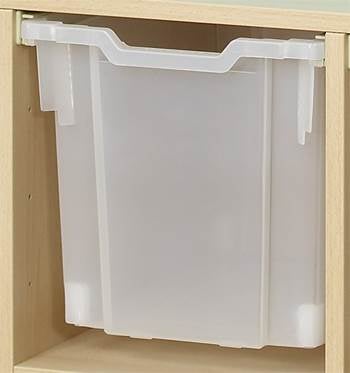 Smidig förvaringsvagn med sex fack och sex höga plastbackar. Plastlådorna glider på plastmedar. Vagnen har fyra svängbara hjul, varav två med broms. Välj mellan vagn i bok-, björk- eller vit laminat och plastbackar i färgerna röd, blå eller transparent.