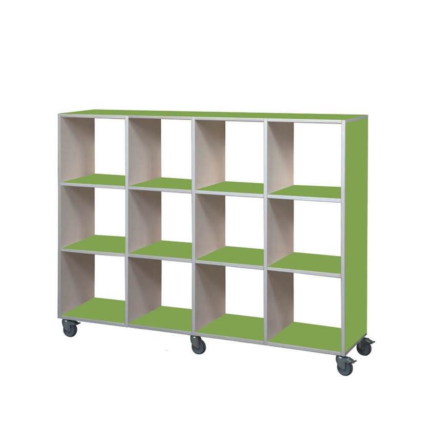 Högkvalitativ öppen kubhylla av 18 mm vitpigmenterad björkkryssfanér. Kubens hyllor, utsida och topp är klädd med laminat, välj mellan 5 olika färger. Levereras med låsbara hjul.