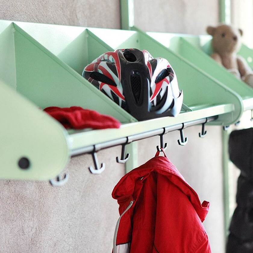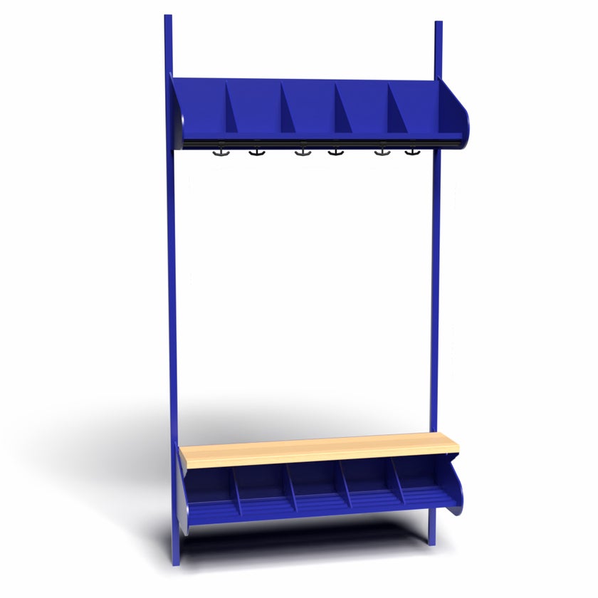 Det flexibla inredningssystemet avsett för entréer och kapprum. Enheterna i pulverlackerad stålplåt med hög finish. Startsektionen består av 2 st väggskenor längd 2000 mm, 1 st hatthylla, 1 st skohylla samt 1 st sittbänk med sits i björklaminat. Hatt- och skohyllorna är avdelade med mellanväggar. Kroklist och dropplåt finns som tillval. Kan fås i 15 olika färger.