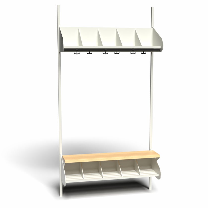 Det flexibla inredningssystemet avsett för entréer och kapprum. Enheterna i pulverlackerad stålplåt med hög finish. Startsektionen består av 2 st väggskenor längd 2000 mm, 1 st hatthylla, 1 st skohylla samt 1 st sittbänk med sits i björklaminat. Hatt- och skohyllorna är avdelade med mellanväggar. Kroklist och dropplåt finns som tillval. Kan fås i 15 olika färger.