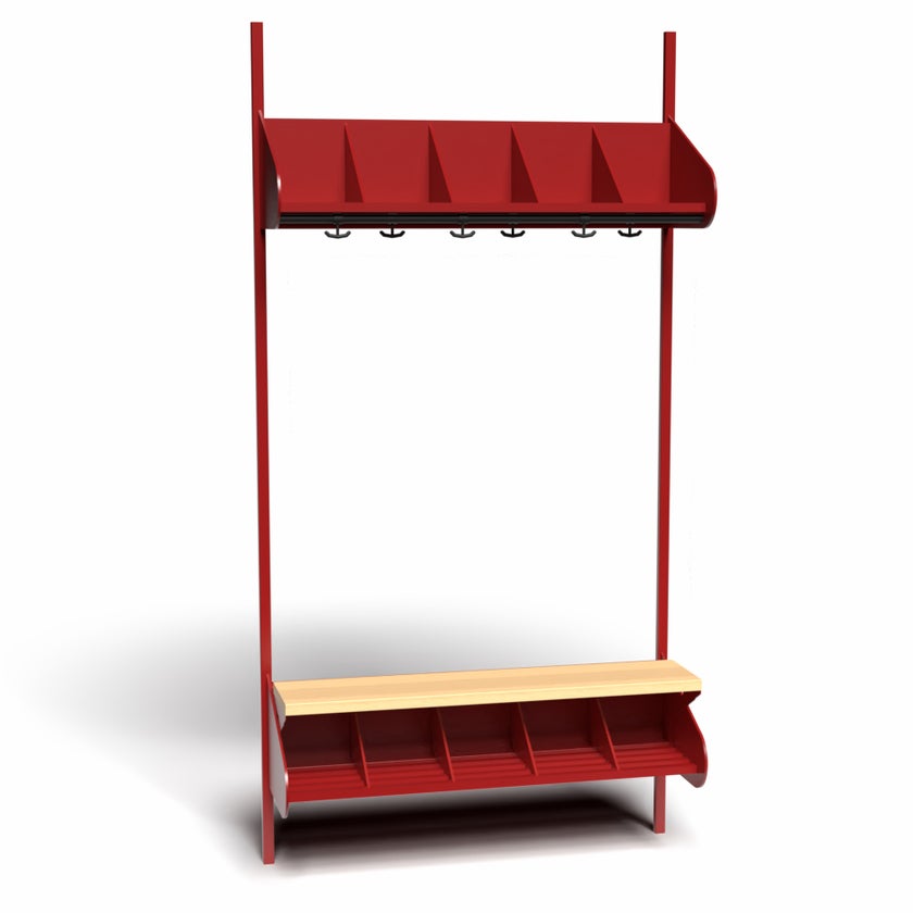 Det flexibla inredningssystemet avsett för entréer och kapprum. Enheterna i pulverlackerad stålplåt med hög finish. Startsektionen består av 2 st väggskenor längd 2000 mm, 1 st hatthylla, 1 st skohylla samt 1 st sittbänk med sits i björklaminat. Hatt- och skohyllorna är avdelade med mellanväggar. Kroklist och dropplåt finns som tillval. Kan fås i 15 olika färger.