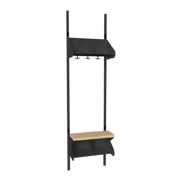 Det flexibla inredningssystemet avsett för entréer och kapprum. Enheterna i pulverlackerad stålplåt med hög finish. Startsektionen består av 2 st väggskenor längd 2000 mm, 1 st hatthylla, 1 st skohylla samt 1 st sittbänk med sits i björklaminat. Hatt- och skohyllorna är avdelade med mellanväggar. Kroklist och dropplåt finns som tillval. Kan fås i 15 olika färger.
