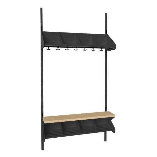 Det flexibla inredningssystemet avsett för entréer och kapprum. Enheterna i pulverlackerad stålplåt med hög finish. Startsektionen består av 2 st väggskenor längd 2000 mm, 1 st hatthylla, 1 st skohylla samt 1 st sittbänk med sits i björklaminat. Hatt- och skohyllorna är avdelade med mellanväggar. Kroklist och dropplåt finns som tillval. Kan fås i 15 olika färger.