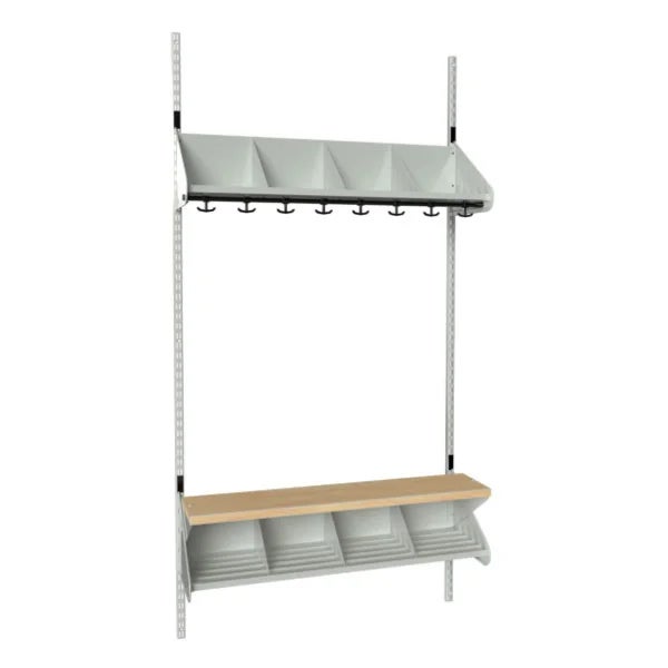 Det flexibla inredningssystemet avsett för entréer och kapprum. Enheterna i pulverlackerad stålplåt med hög finish. Startsektionen består av 2 st väggskenor längd 2000 mm, 1 st hatthylla, 1 st skohylla samt 1 st sittbänk med sits i björklaminat. Hatt- och skohyllorna är avdelade med mellanväggar. Kroklist och dropplåt finns som tillval. Kan fås i 15 olika färger.