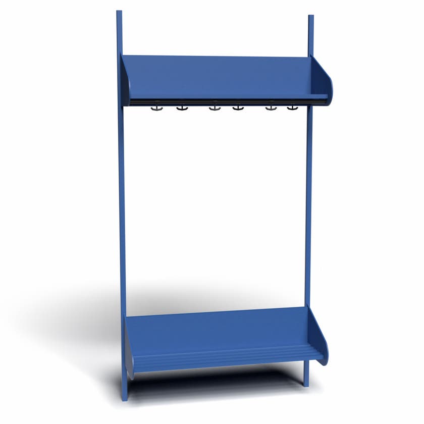 Det flexibla inredningssystemet avsett för entréer och kapprum. Enheterna i pulverlackerad stålplåt med hög finish. Startsektionen består av 2 st väggskenor längd 2000 mm, 1 st hatthylla samt 1 st skohylla. Kan fås i 15 olika färger.