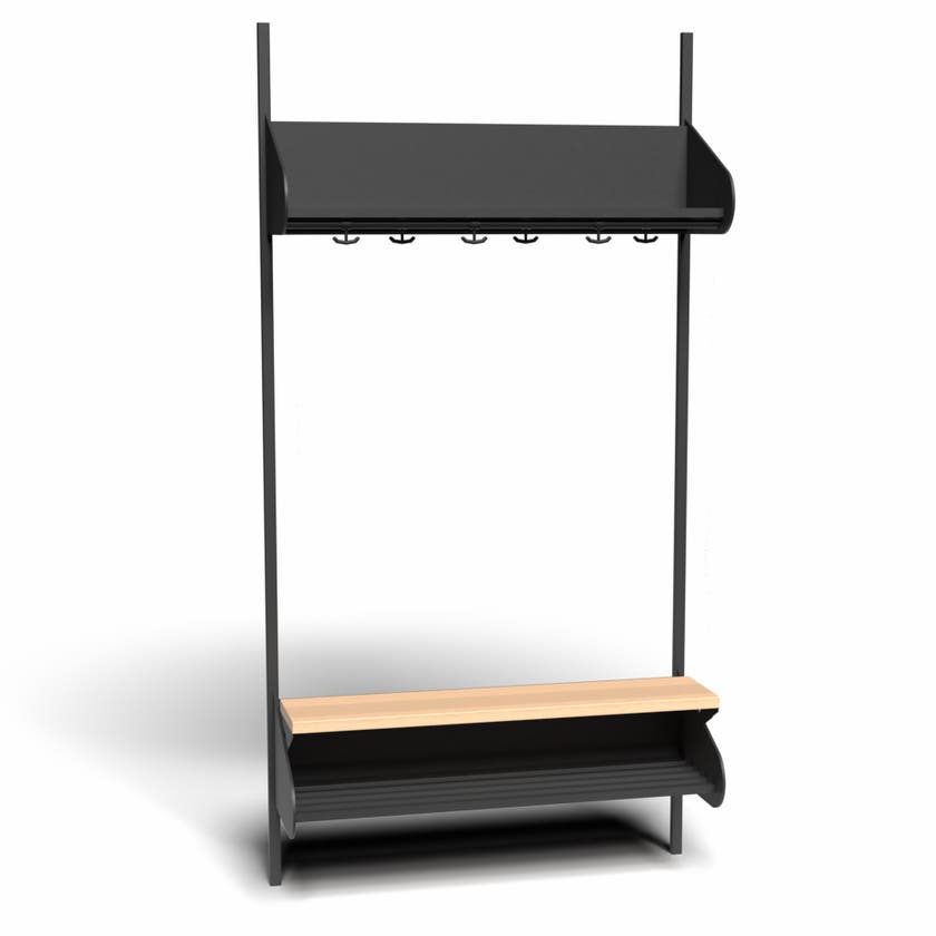 Det flexibla inredningssystemet avsett för entréer och kapprum. Enheterna i pulverlackerad stålplåt med hög finish. Startsektionen består av 2 st väggskenor längd 2000 mm, 1 st hatthylla, 1 st skohylla samt 1 st sittbänk med sits i björklaminat. Kroklist och dropplåt finns som tillval. Kan fås i 15 olika färger.