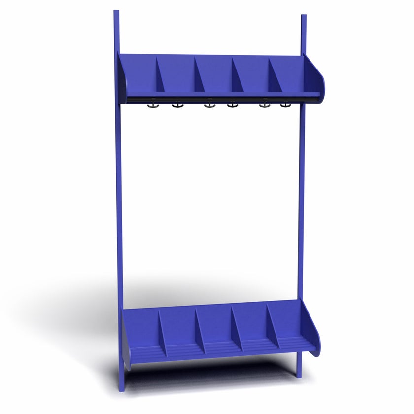 Det flexibla inredningssystemet avsett för entréer och kapprum. Enheterna i pulverlackerad stålplåt med hög finish. Startsektionen består av 2 st väggskenor längd 2000 mm, 1 st hatthylla samt 1 st skohylla. Hatt- och skohyllorna är avdelade med mellanväggar. Kroklist och dropplåt finns som tillval. Kan fås i 15 olika färger.