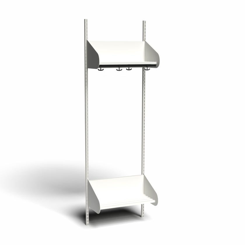 Flexibelt inredningssystem för entréer och kapprum. Tillverkat i pulverlackerad stålplåt med hög finish. Välj mellan en mängd olika standardfärger.