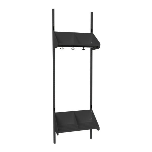 Det flexibla inredningssystemet avsett för entréer och kapprum. Enheterna i pulverlackerad stålplåt med hög finish. Startsektionen består av 2 st väggskenor längd 2000 mm, 1 st hatthylla samt 1 st skohylla. Hatt- och skohyllorna är avdelade med mellanväggar. Kroklist och dropplåt finns som tillval. Kan fås i 15 olika färger.