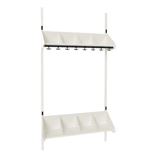 Det flexibla inredningssystemet avsett för entréer och kapprum. Enheterna i pulverlackerad stålplåt med hög finish. Startsektionen består av 2 st väggskenor längd 2000 mm, 1 st hatthylla samt 1 st skohylla. Hatt- och skohyllorna är avdelade med mellanväggar. Kroklist och dropplåt finns som tillval. Kan fås i 15 olika färger.