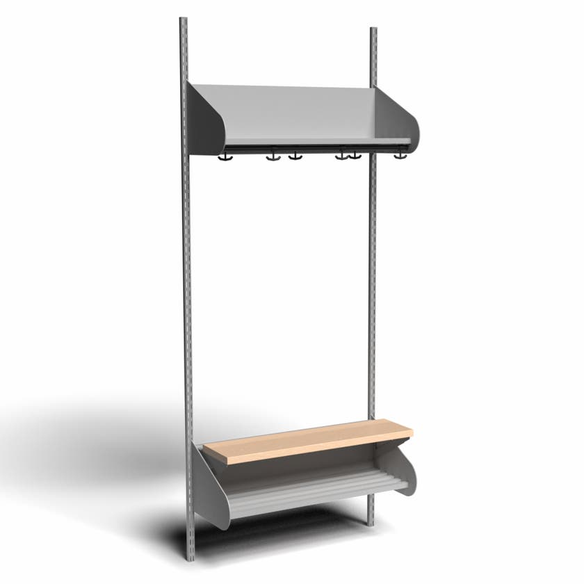 Det flexibla inredningssystemet avsett för entréer och kapprum. Enheterna i pulverlackerad stålplåt med hög finish. Startsektionen består av 2 st väggskenor längd 2000 mm, 1 st hatthylla, 1 st skohylla samt 1 st sittbänk med sits i björklaminat. Kroklist och dropplåt finns som tillval. Kan fås i 15 olika färger.