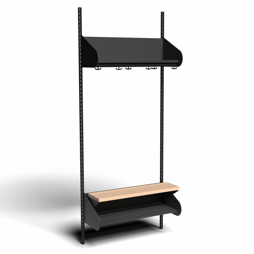 Det flexibla inredningssystemet avsett för entréer och kapprum. Enheterna i pulverlackerad stålplåt med hög finish. Startsektionen består av 2 st väggskenor längd 2000 mm, 1 st hatthylla, 1 st skohylla samt 1 st sittbänk med sits i björklaminat. Kroklist och dropplåt finns som tillval. Kan fås i 15 olika färger.