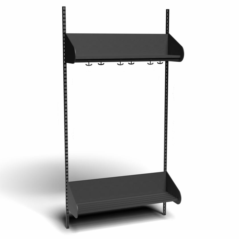 Flexibelt inredningssystem för entréer och kapprum. Tillverkat i pulverlackerad stålplåt med hög finish. Välj mellan en mängd olika standardfärger.