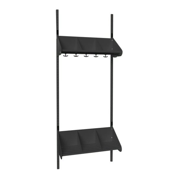 Det flexibla inredningssystemet avsett för entréer och kapprum. Enheterna i pulverlackerad stålplåt med hög finish. Startsektionen består av 2 st väggskenor längd 2000 mm, 1 st hatthylla samt 1 st skohylla. Hatt- och skohyllorna är avdelade med mellanväggar. Kroklist och dropplåt finns som tillval. Kan fås i 15 olika färger.