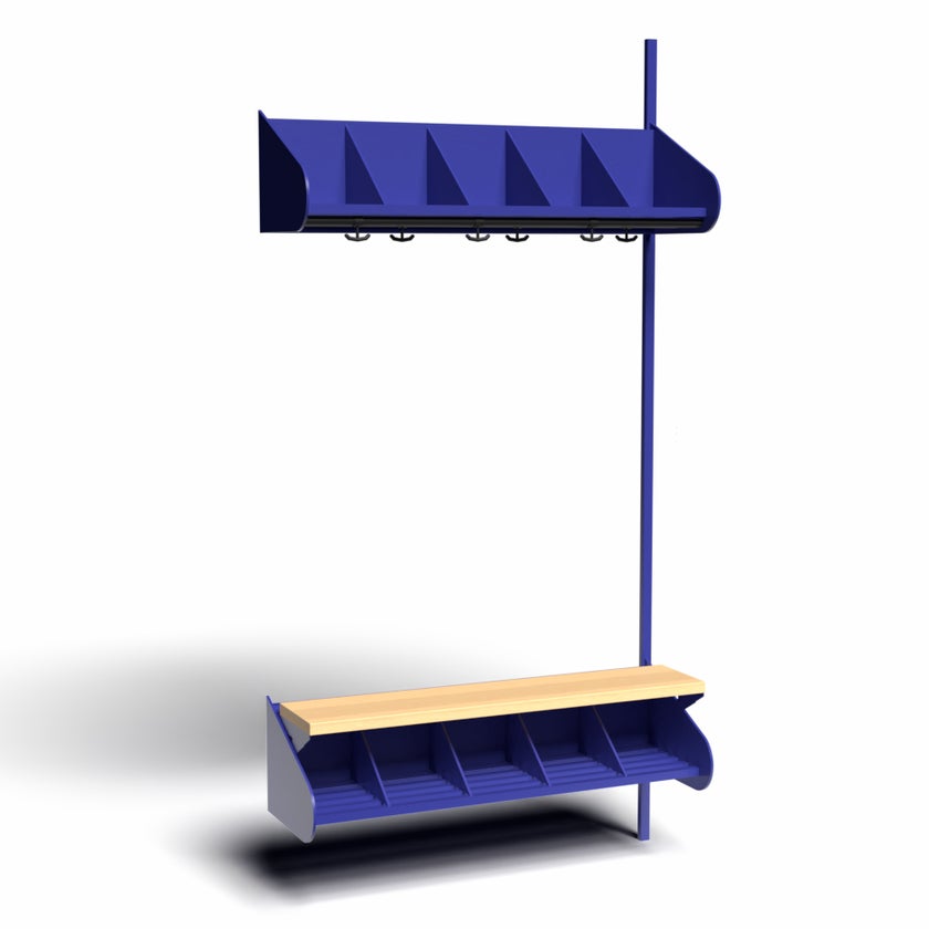 Det flexibla inredningssystemet avsett för entréer och kapprum. Enheterna i pulverlackerad stålplåt med hög finish. Påbyggnadssektionen består av 1 st väggskena längd 2000 mm, 1 st hatthylla, 1 st skohylla samt 1 st sittbänk med sits i björklaminat. Hatt- och skohyllorna är avdelade med mellanväggar. Kroklist och dropplåt finns som tillval. Kan fås i 15 olika färger.