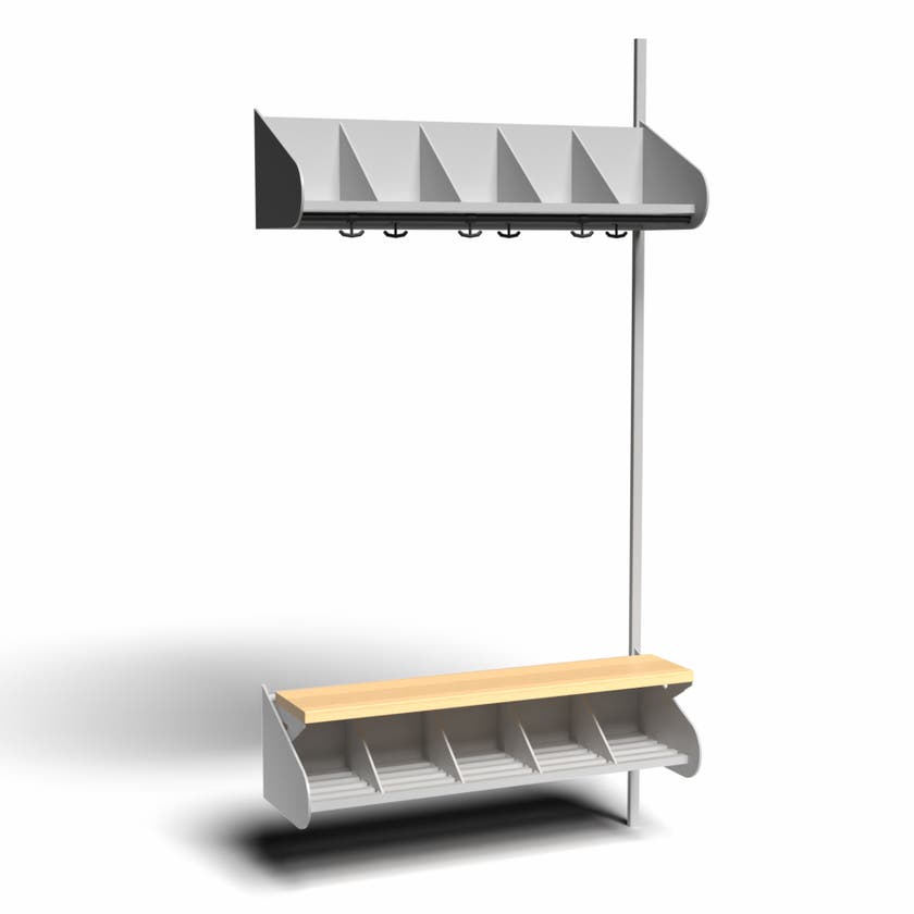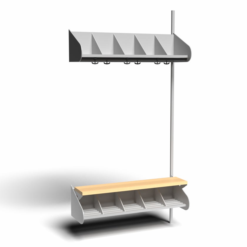 Det flexibla inredningssystemet avsett för entréer och kapprum. Enheterna i pulverlackerad stålplåt med hög finish. Påbyggnadssektionen består av 1 st väggskena längd 2000 mm, 1 st hatthylla, 1 st skohylla samt 1 st sittbänk med sits i björklaminat. Hatt- och skohyllorna är avdelade med mellanväggar. Kroklist och dropplåt finns som tillval. Kan fås i 15 olika färger.