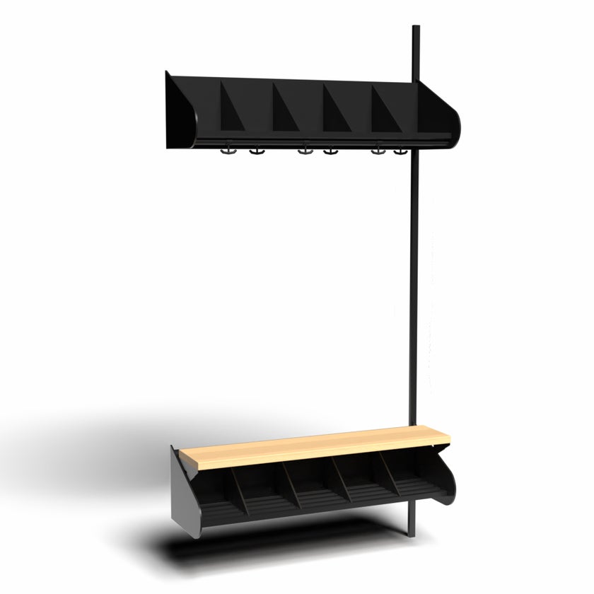 Det flexibla inredningssystemet avsett för entréer och kapprum. Enheterna i pulverlackerad stålplåt med hög finish. Påbyggnadssektionen består av 1 st väggskena längd 2000 mm, 1 st hatthylla, 1 st skohylla samt 1 st sittbänk med sits i björklaminat. Hatt- och skohyllorna är avdelade med mellanväggar. Kroklist och dropplåt finns som tillval. Kan fås i 15 olika färger.