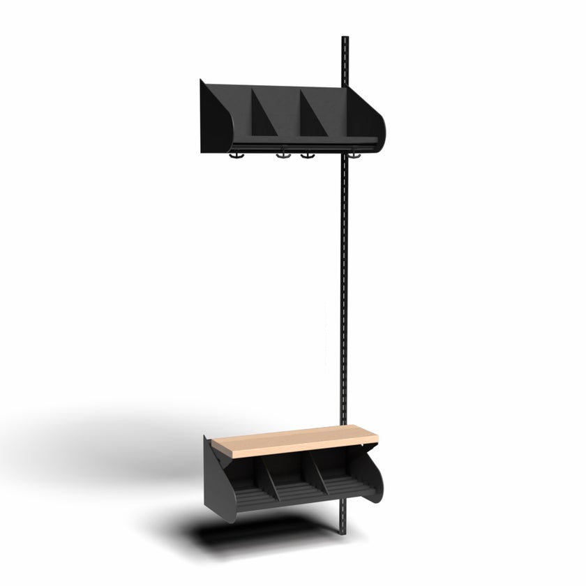 Det flexibla inredningssystemet avsett för entréer och kapprum. Enheterna i pulverlackerad stålplåt med hög finish. Påbyggnadssektionen består av 1 st väggskena längd 2000 mm, 1 st hatthylla, 1 st skohylla samt 1 st sittbänk med sits i björklaminat. Hatt- och skohyllorna är avdelade med mellanväggar. Kroklist och dropplåt finns som tillval. Kan fås i 15 olika färger.