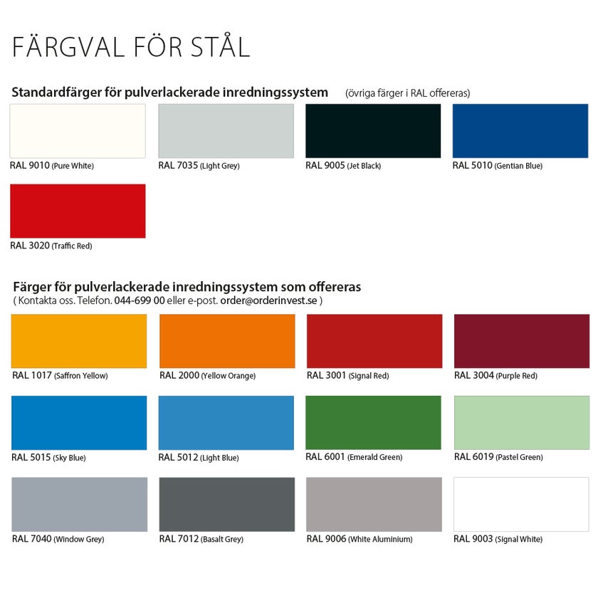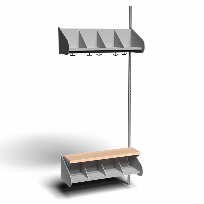 Det flexibla inredningssystemet avsett för entréer och kapprum. Enheterna i pulverlackerad stålplåt med hög finish. Påbyggnadssektionen består av 1 st väggskena längd 2000 mm, 1 st hatthylla, 1 st skohylla samt 1 st sittbänk med sits i björklaminat. Hatt- och skohyllorna är avdelade med mellanväggar. Kroklist och dropplåt finns som tillval. Kan fås i 15 olika färger.