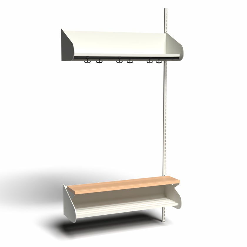 Det flexibla inredningssystemet avsett för entréer och kapprum. Enheterna i pulverlackerad stålplåt med hög finish. Påbyggnadssektionen består av 1 st väggskena längd 2000 mm, 1 st hatthylla, 1 st skohylla samt 1 st sittbänk med sits i björklaminat. Kroklist och dropplåt finns som tillval. Kan fås i 15 olika färger.