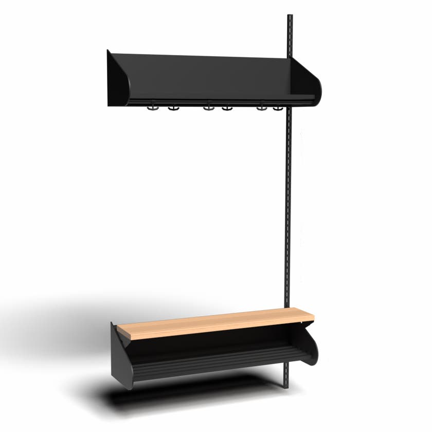 Det flexibla inredningssystemet avsett för entréer och kapprum. Enheterna i pulverlackerad stålplåt med hög finish. Påbyggnadssektionen består av 1 st väggskena längd 2000 mm, 1 st hatthylla, 1 st skohylla samt 1 st sittbänk med sits i björklaminat. Kroklist och dropplåt finns som tillval. Kan fås i 15 olika färger.