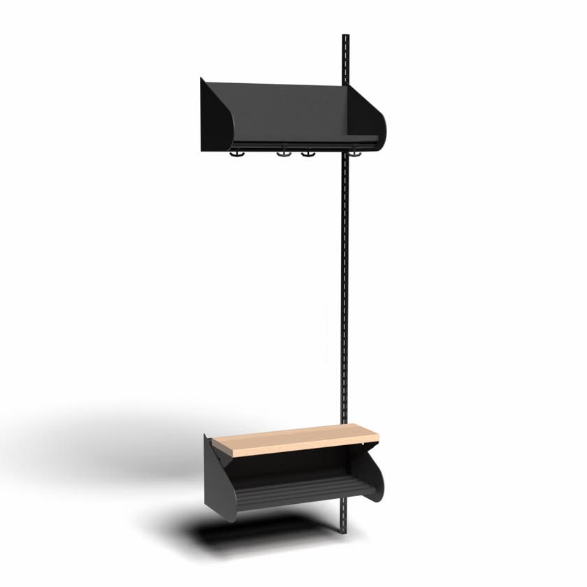 Det flexibla inredningssystemet avsett för entréer och kapprum. Enheterna i pulverlackerad stålplåt med hög finish. Påbyggnadssektionen består av 1 st väggskena längd 2000 mm, 1 st hatthylla, 1 st skohylla samt 1 st sittbänk med sits i björklaminat. Kroklist och dropplåt finns som tillval. Kan fås i 15 olika färger.