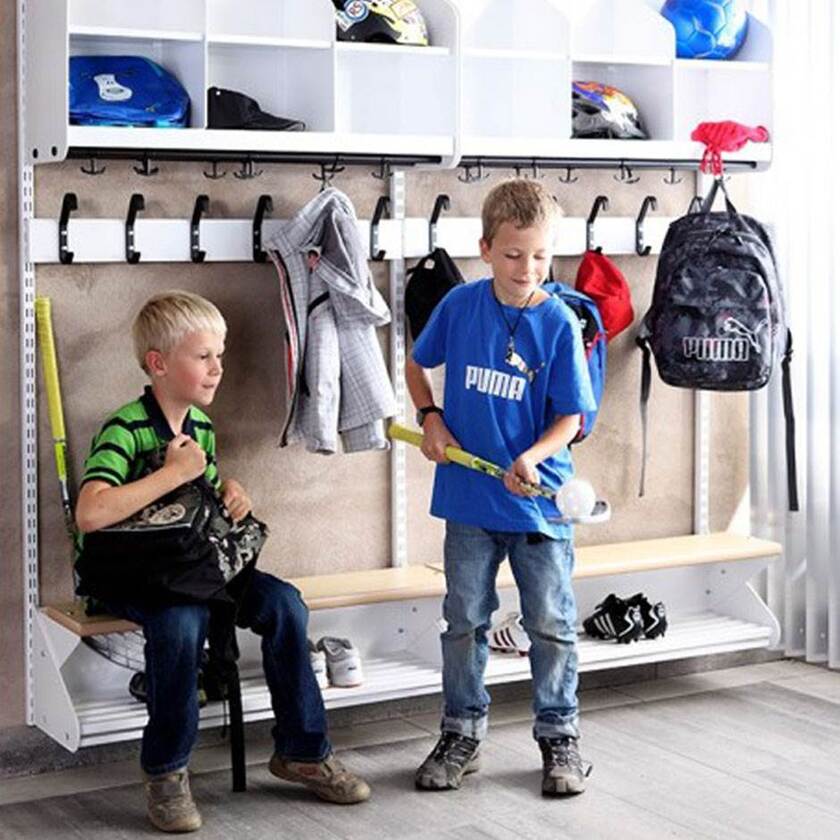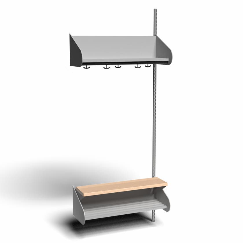 Det flexibla inredningssystemet avsett för entréer och kapprum. Enheterna i pulverlackerad stålplåt med hög finish. Påbyggnadssektionen består av 1 st väggskena längd 2000 mm, 1 st hatthylla, 1 st skohylla samt 1 st sittbänk med sits i björklaminat. Kroklist och dropplåt finns som tillval. Kan fås i 15 olika färger.