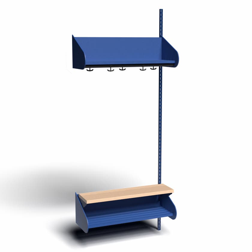 Det flexibla inredningssystemet avsett för entréer och kapprum. Enheterna i pulverlackerad stålplåt med hög finish. Påbyggnadssektionen består av 1 st väggskena längd 2000 mm, 1 st hatthylla, 1 st skohylla samt 1 st sittbänk med sits i björklaminat. Kroklist och dropplåt finns som tillval. Kan fås i 15 olika färger.