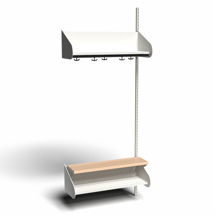 Det flexibla inredningssystemet avsett för entréer och kapprum. Enheterna i pulverlackerad stålplåt med hög finish. Påbyggnadssektionen består av 1 st väggskena längd 2000 mm, 1 st hatthylla, 1 st skohylla samt 1 st sittbänk med sits i björklaminat. Kroklist och dropplåt finns som tillval. Kan fås i 15 olika färger.