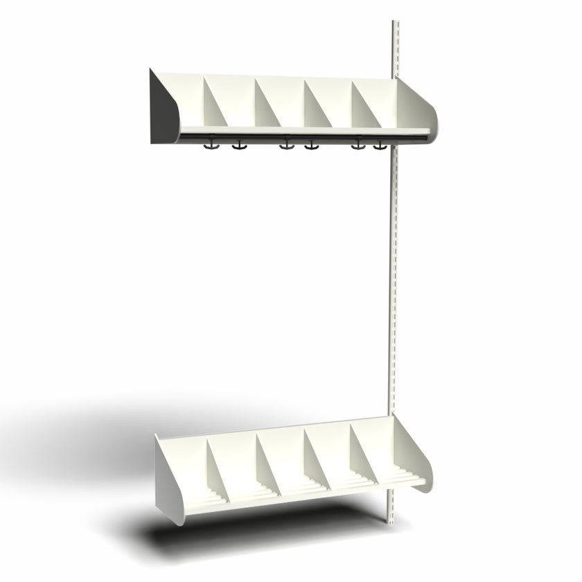 Det flexibla inredningssystemet avsett för entréer och kapprum. Enheterna i pulverlackerad stålplåt med hög finish. Påbyggnadssektionen består av 1 st väggskena längd 2000 mm, 1 st hatthylla samt 1 st skohylla. Hatt- och skohyllorna är avdelade med mellanväggar. Kroklist och dropplåt finns som tillval. Kan fås i 15 olika färger.